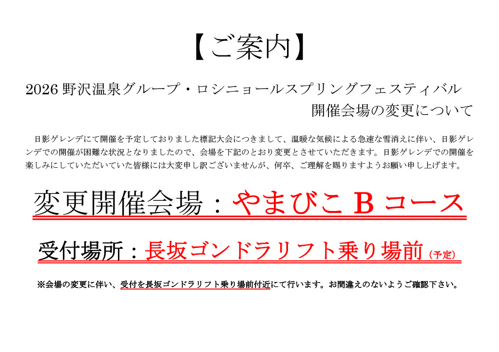 日影ゲレンデにて開催を予定しておりました標記大会につきまして、温暖な気候による急速な雪消えに伴い、日影ゲレンデでの開催が困難な状況となりましたので、会場を『やまびこBコース』に変更し開催いたします。