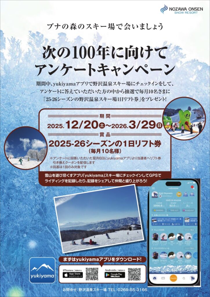 information スキー場からのお知らせ TOP スキー場からのお知らせ◆次の100年に向けてアンケートキャンペーン開催 ◆次の100年に向けてアンケートキャンペーン開催 お知らせ UPDATE : 2025.12.20 12月20日(土)~3月29日(日)までの期間中yukiyamaアプリで野沢温泉スキー場チェックインをしてアンケートに答えていただいた方の中から抽選で毎月10名さまに「2025-2026シーズンの野沢温泉スキー場1日リフト券」をプレゼントさせていただきます!是非アンケートへのご協力をお願い致します。 前の記事へ 一覧に戻る