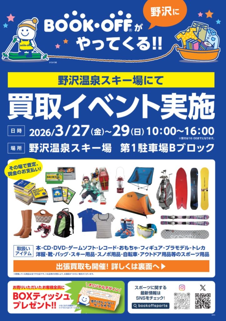 information スキー場からのお知らせ TOP スキー場からのお知らせBOOKOFF買取ブースについて BOOKOFF買取ブースについて お知らせ UPDATE : 2026.03.25 BOOKOFFの買取ブースがユキヤマまつりイベント期間中登場!今シーズン使ったギアやアイテムなどお持ち寄りください。なんでもBOOKOFFが出張買取します。期間:2026年3月27日(金)~29日(日)場所:野沢温泉スキー場第1駐車場Bブロックスキー場側 ※28日(土)29日(日)は6:00~14:00までは駐車場有料(1,000円 )となります。 あらかじめご承知おきのほどよろしくお願いいたします。 前の記事へ 一覧に戻る
